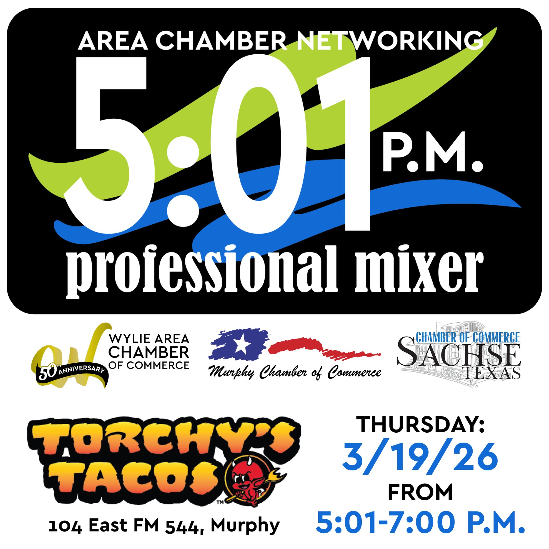 We hope to see you Thursday evening at Torchy’s Tacos in Murphy for our Area Chamber Networking Professional Mixer